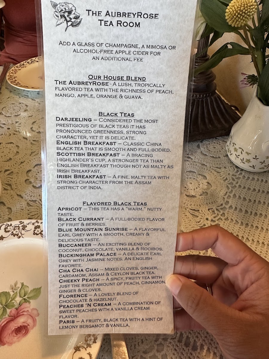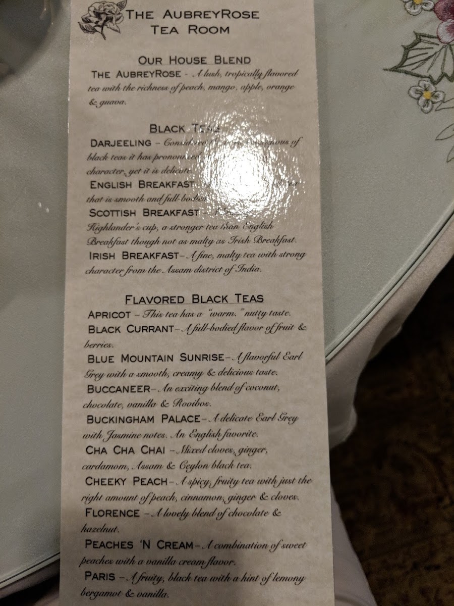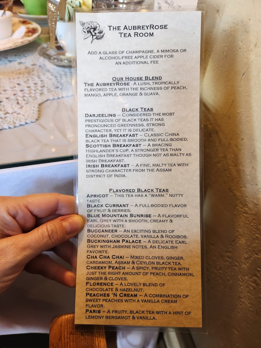 The AubreyRose Tea Room in La Mesa offers a refined yet welcoming afternoon tea experience. Their menu shines with a rich variety of black teas, featuring classics like Darjeeling and English Breakfast alongside vibrant flavored selections such as Buccaneer and Peaches 'N Cream. Decaffeinated options ensure everyone can indulge.